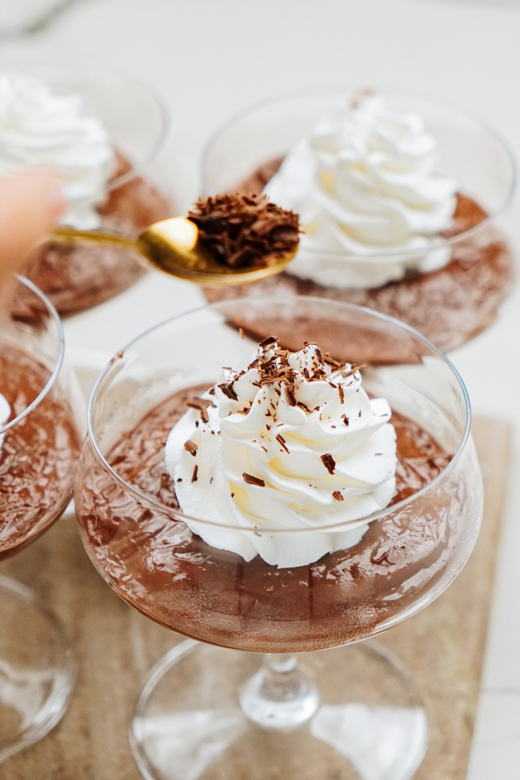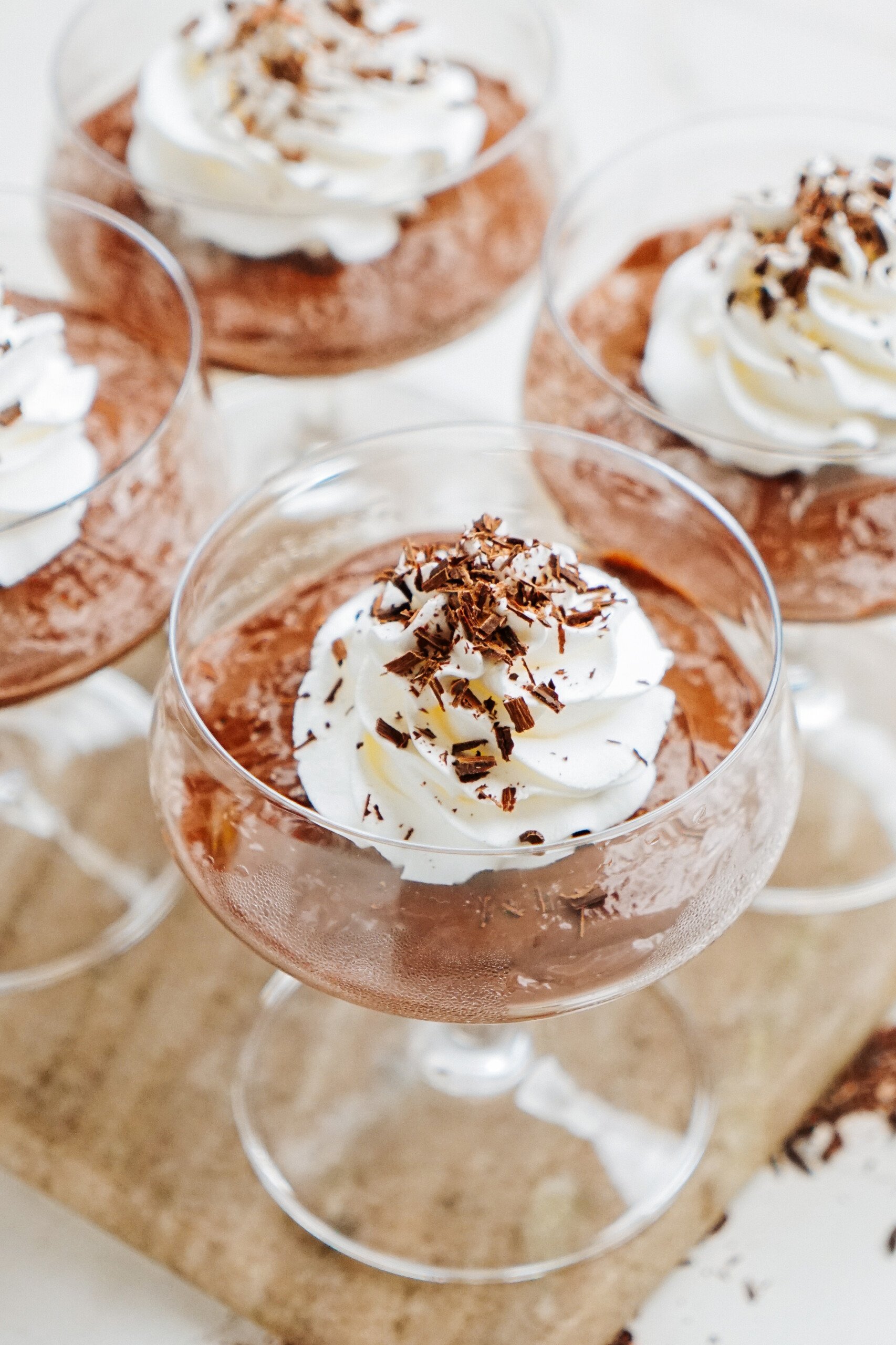 - Once chilled, remove the plastic wrap. Top each serving with whipped cream and a sprinkle of shaved dark chocolate.