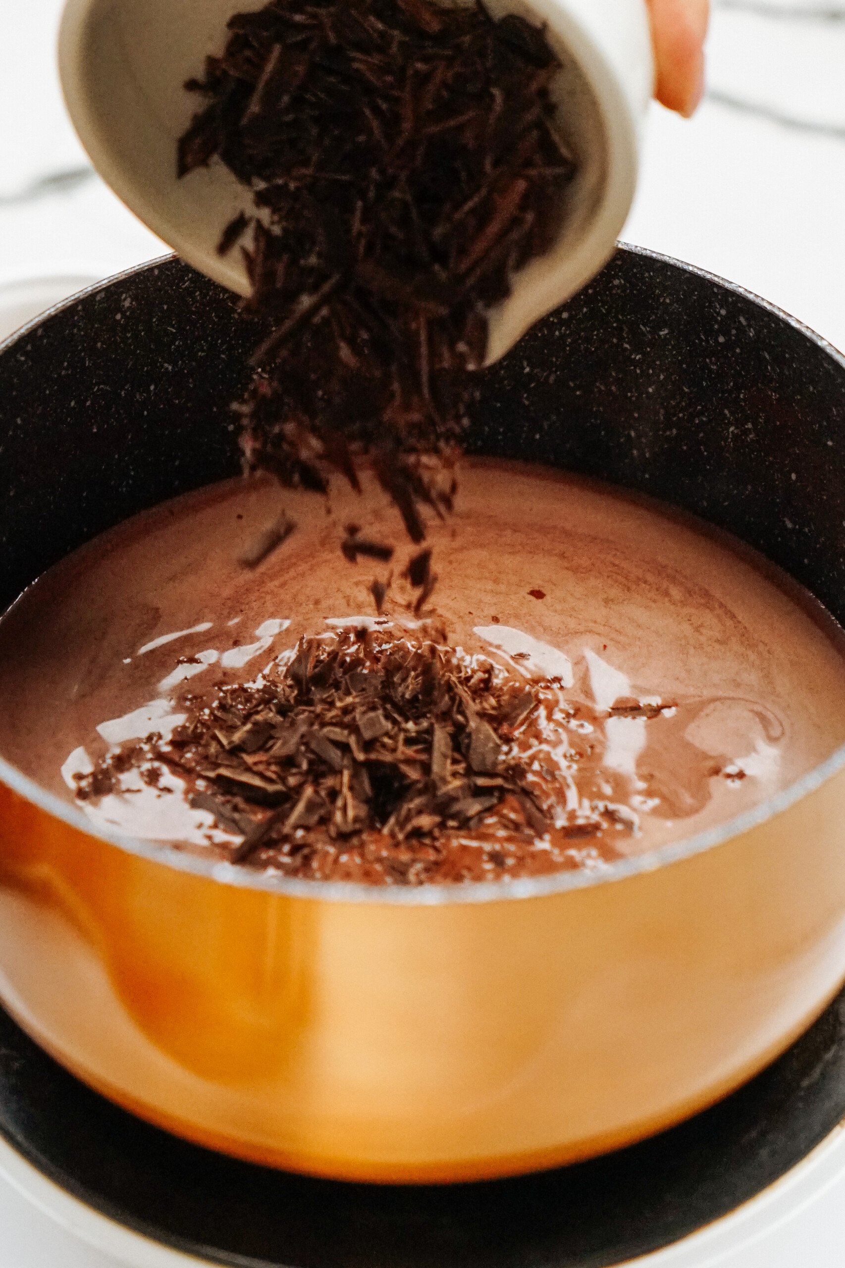 - Before the mixture reaches a boil, add the chopped dark chocolate.