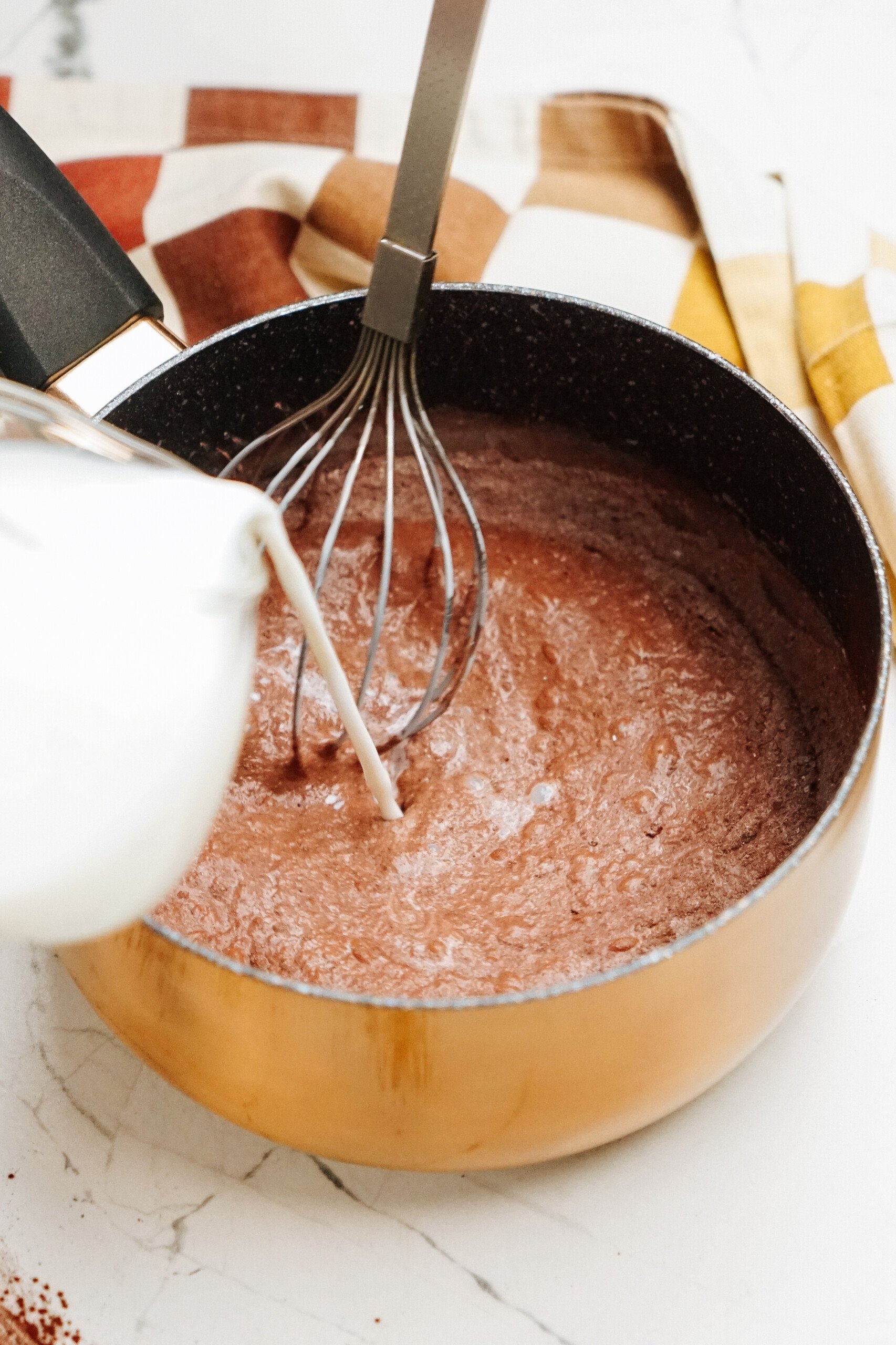 - Continue stirring, switching to a rubber spatula, until the chocolate melts and the pudding thickens to a bubbling consistency.