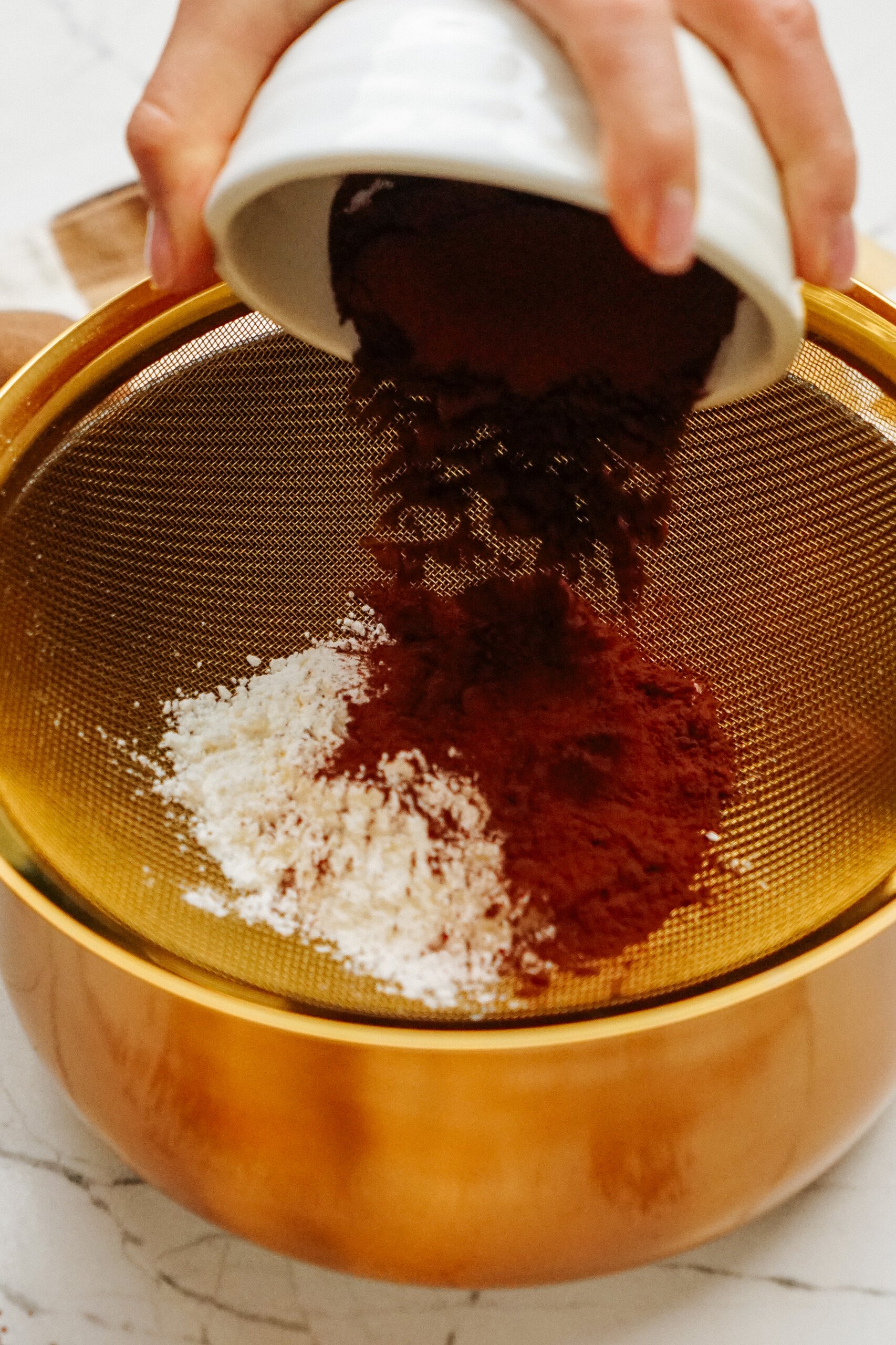 - Sift in cornstarch and cocoa powder and whisk to combine.