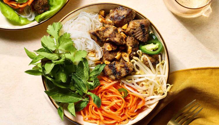 These flavorful grilled beef lettuce wraps combine rice noodles, crisp vegetables, and lemongrass-scented sirloin steak. Cookbook author Steven Raichlen was inspired by the Vietnamese dish bun bo xao: a composed salad of stir-fried beef, delicate vermicelli, crunchy vegetables, lots of fresh herbs, and tart, savory nuoc cham. Here, the barbecue expert recommends grilling the beef instead — slicing it thin, threading it onto skewers, and just barely setting it on the fire for a perfect medium-rare.