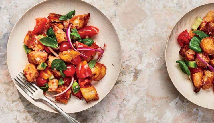 This blockbuster summer panzanella comes from Samin Nosrat, author of Salt, Fat, Acid, Heat. Nosrat combines oven-roasted sourdough croutons with juicy ripe tomatoes, red onion, and crisp cucumbers, finishing everything with extra-virgin olive oil, balsamic vinegar, and fragrant fresh basil. It’s ultimately a deceptively simple salad — one that makes the most of beautiful seasonal ingredients and a little time.