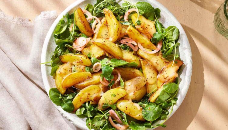 For this satisfying salad, Suzanne Goin steams potatoes then pan-fries them until golden, tossing in slices of Fontina at the very end so they get deliciously melty. Zingy watercress and quick-pickled shallots help cut the richness and keep the dish light enough for a first course.