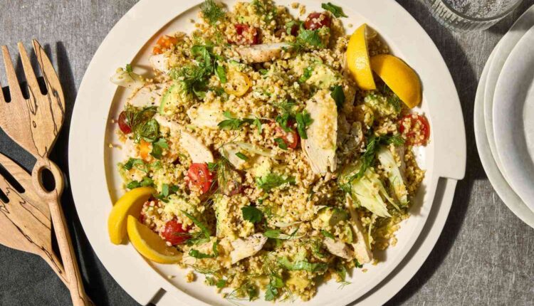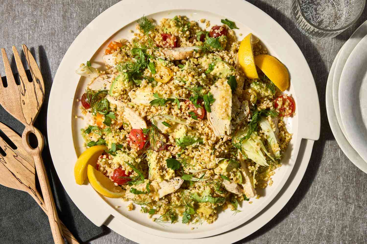 Chef Alfred Portale makes a spectacular avocado terrine that he serves alongside sliced chicken and a bulgur wheat salad. Here, we tossed chunks of avocado with chicken and bulgur to create a less dramatic but equally delicious salad.